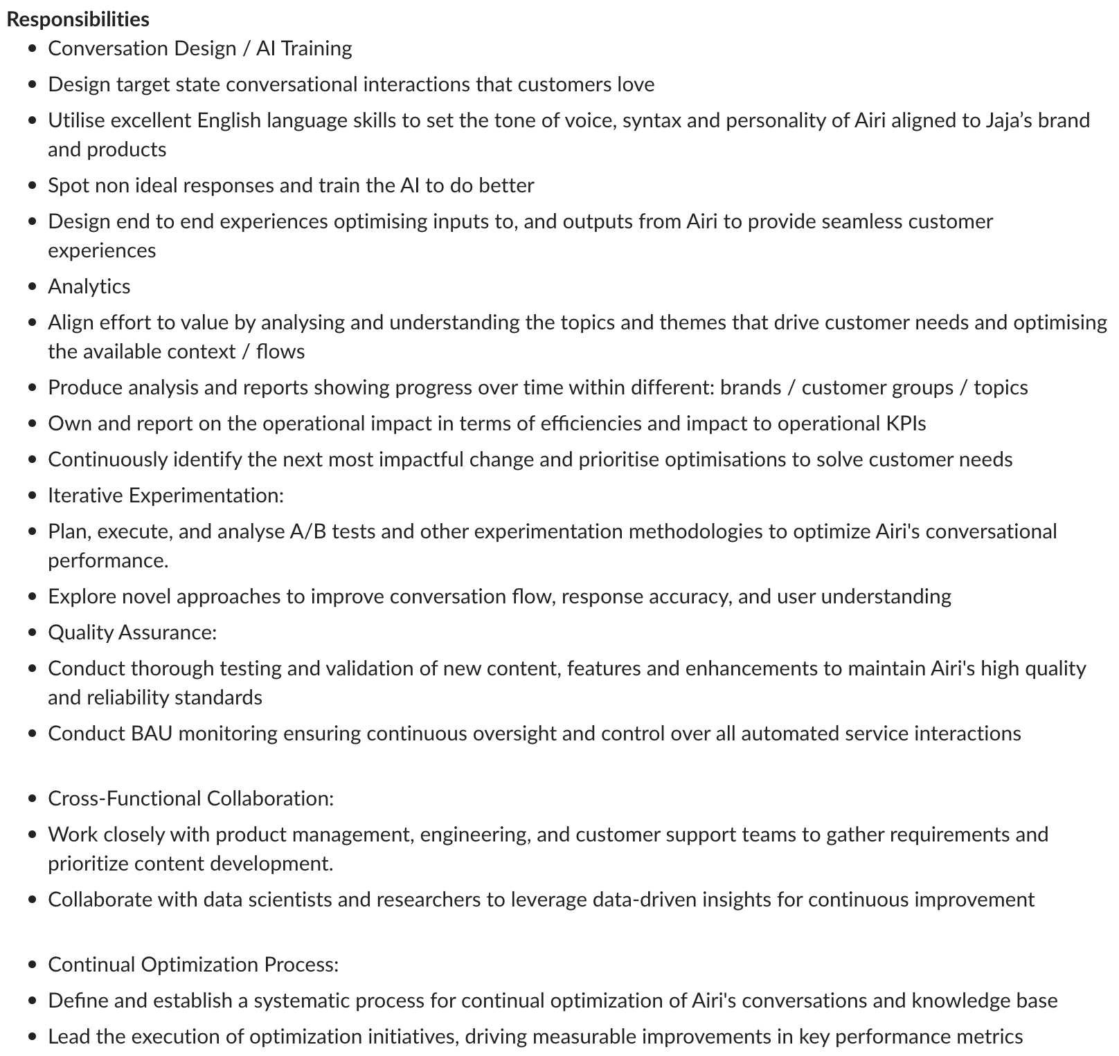 The successful candidate will play a pivotal role in advancing the capabilities and quality of ‘Airi’ our genAI-powered virtual assistant. This role will define and manage the target state of conversation flow and content for virtual assistants at Jaja. You will effectively line manage the AI powered assistants and take ownership of the knowledge base of context and ideal responses that it draws down upon. You will collaborate closely with various teams across the organization to shape and mold the chatbot into a best in class customer experience. If you're passionate about pushing the boundaries of AI technology and delivering exceptional user experiences, this role is for you.