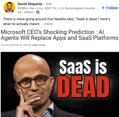 Add to that, the recent "AI Agents will kill SaaS" headlines (Example: Microsoft CEO: AI Agents Will Transform SaaS as We Know It) doing the rounds on LinkedIn and other platforms, and we've got a lot of excitement moving in the wider marketplace – see the screenshot below from this LinkedIn share.
