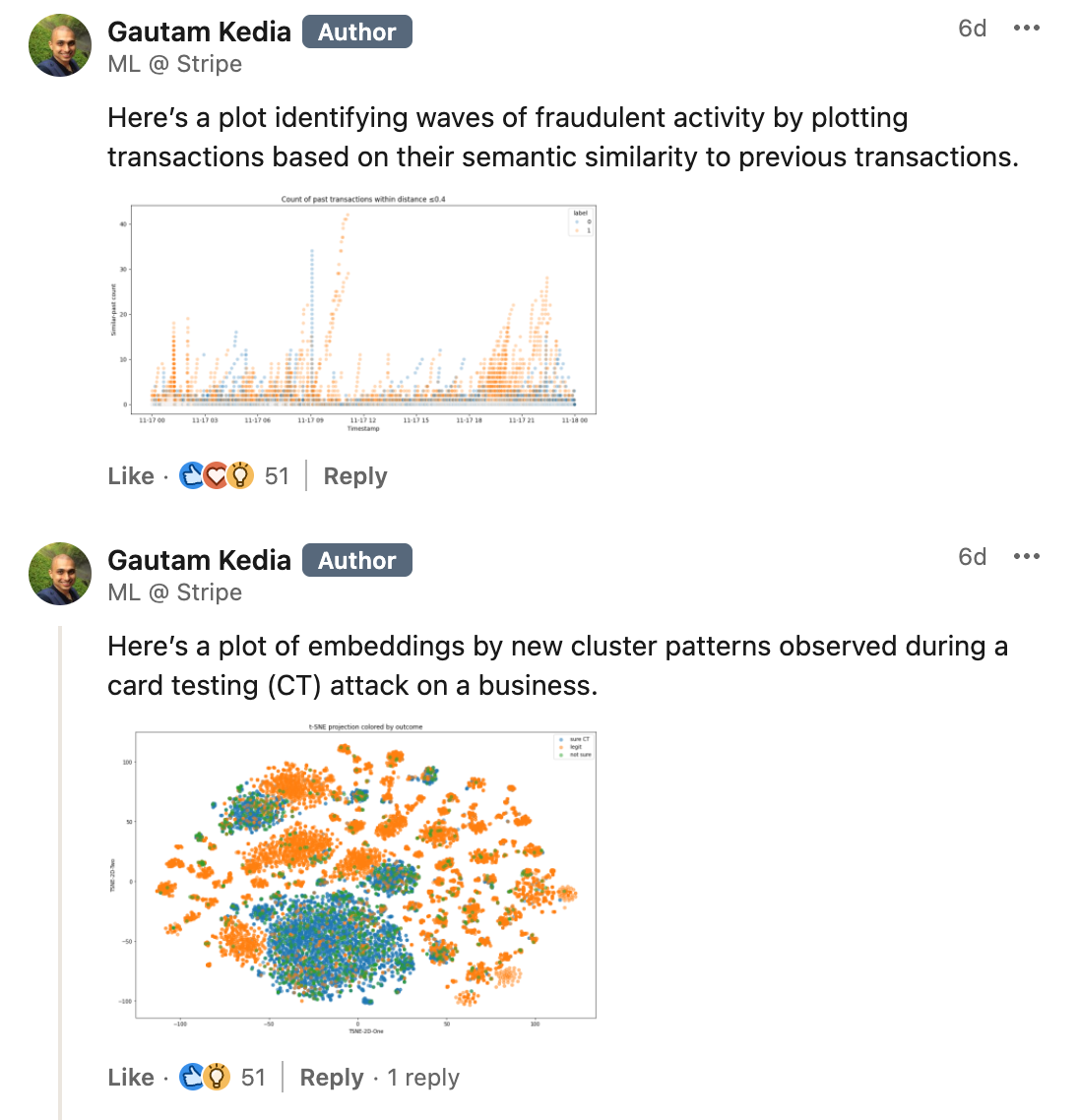 He continues: "Payments that share similarities naturally cluster together: transactions from the same card issuer are positioned closer together, those from the same bank even closer, and those sharing the same email address are nearly identical."
