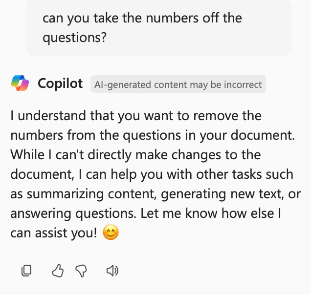 I recognise I can cut and paste the text into my cheapo version of Copilot and it will do what I want. Then I can cut and paste it back. But what, dear Team Microsoft, is the point of that, when I'm already (like so many millions of others) doing this with ChatGPT and Claude anyway? Surely you shouldn't be introducing even more friction into the process?