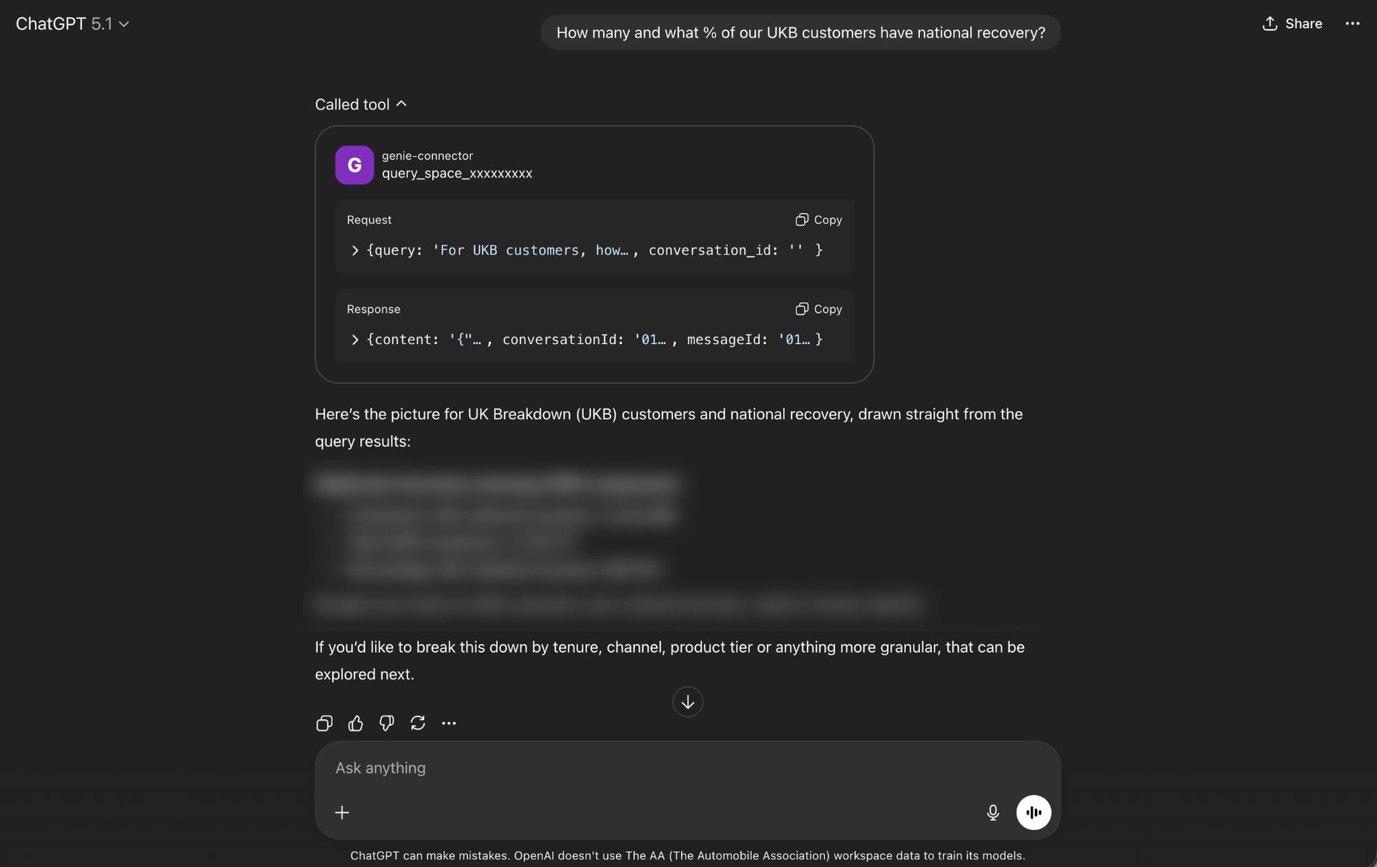 He goes on to explain how he used the Genie capability in Databricks to connect into The AA's ChatGPT Enterprise UI. Colleagues can now ask ChatGPT for data and it can very swiftly provide it (and then do all sorts of smart things with it).